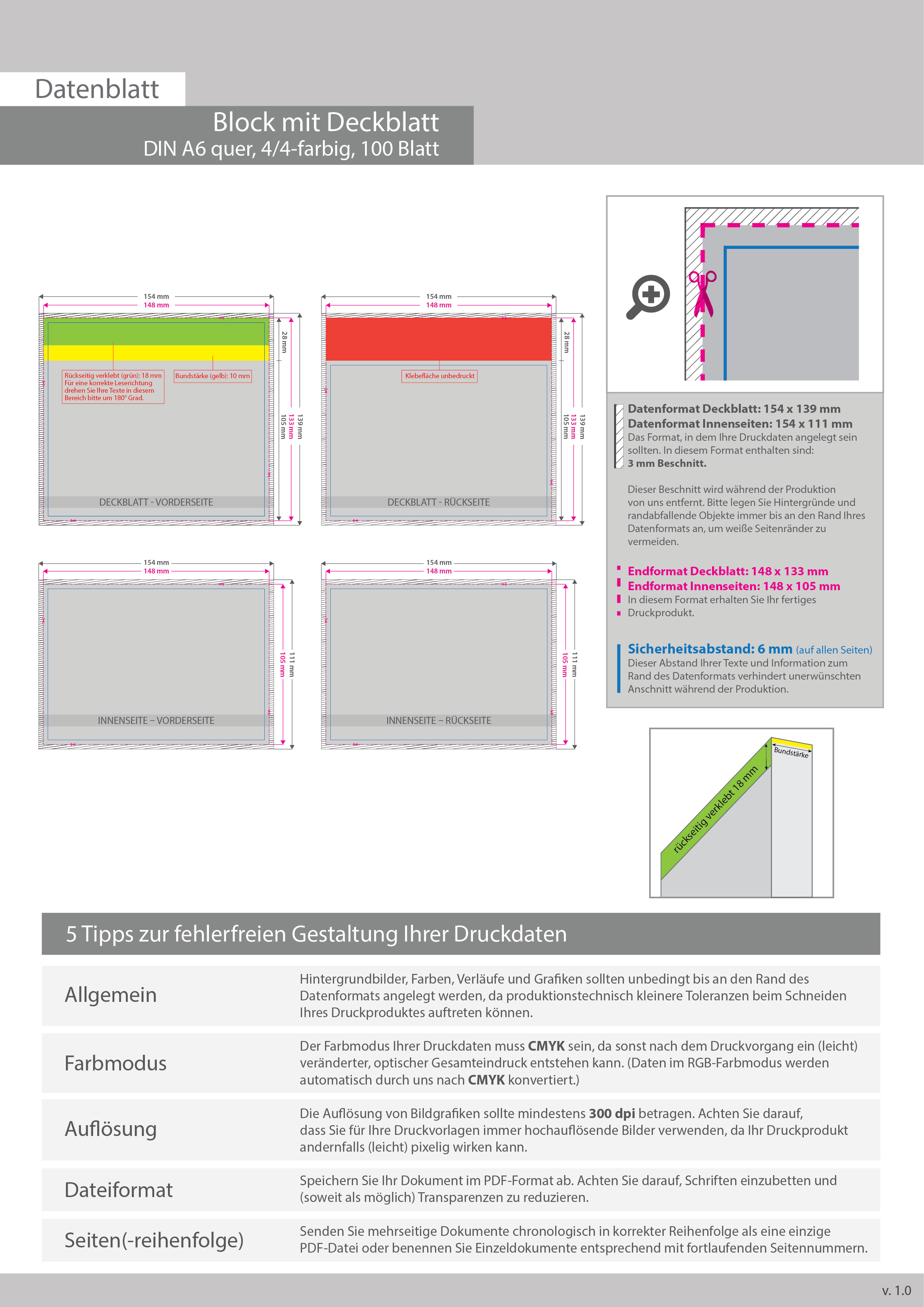 Block mit Leimbindung und Deckblatt, DIN A6 quer, 100 Blatt, 4/4 farbig beidseitig bedruckt