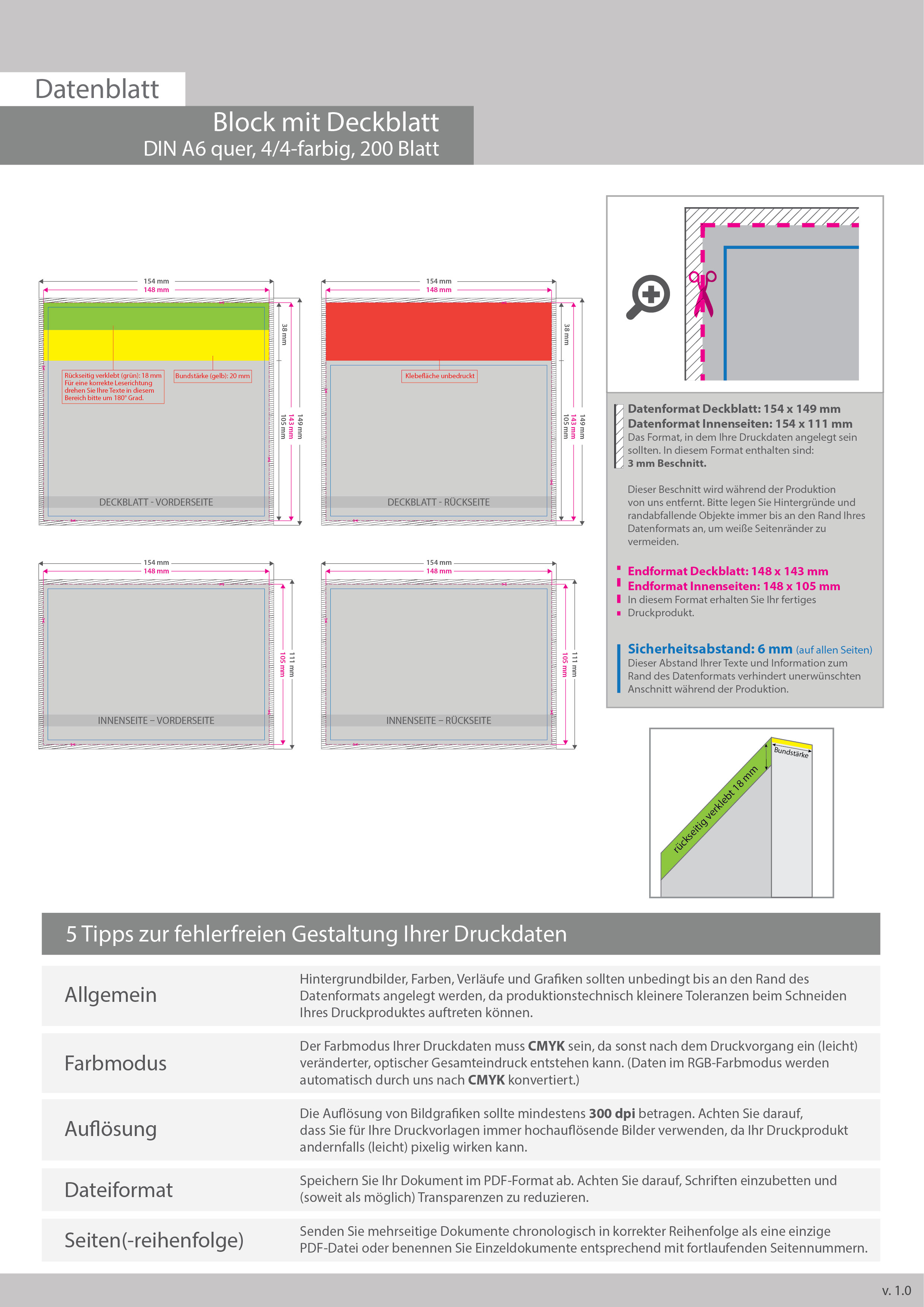 Block mit Leimbindung und Deckblatt, DIN A6 quer, 200 Blatt, 4/4 farbig beidseitig bedruckt