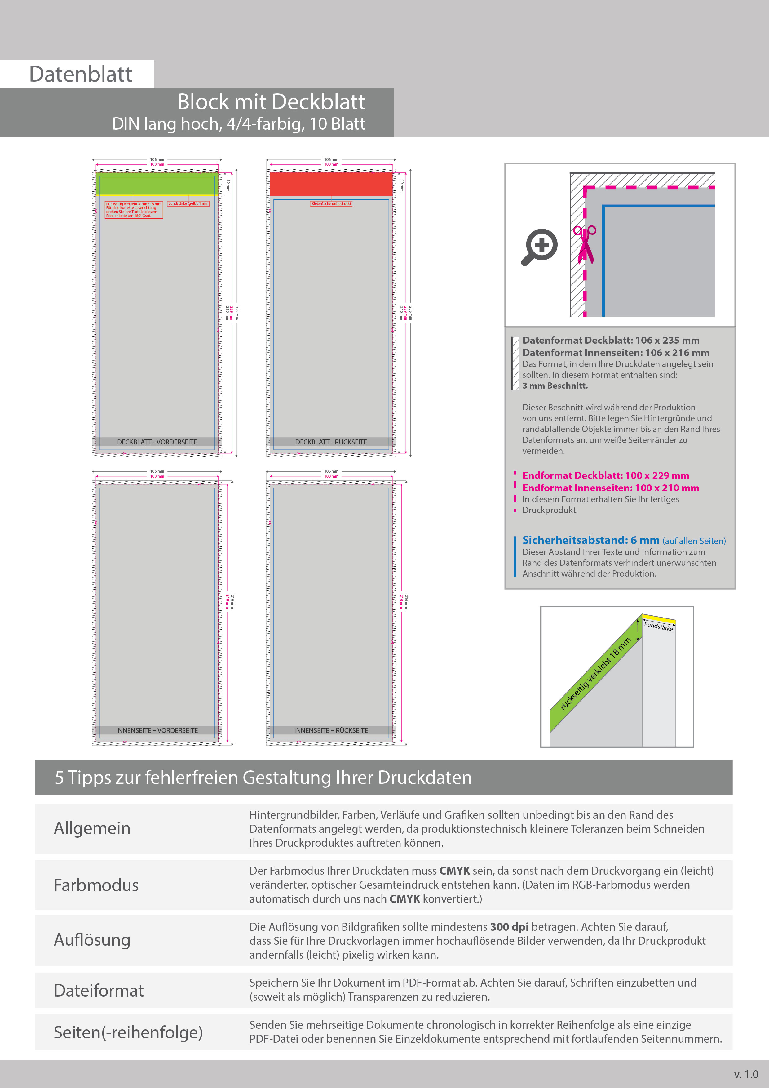 Block mit Leimbindung und Deckblatt, DIN lang, 10 Blatt, 4/4 farbig beidseitig bedruckt