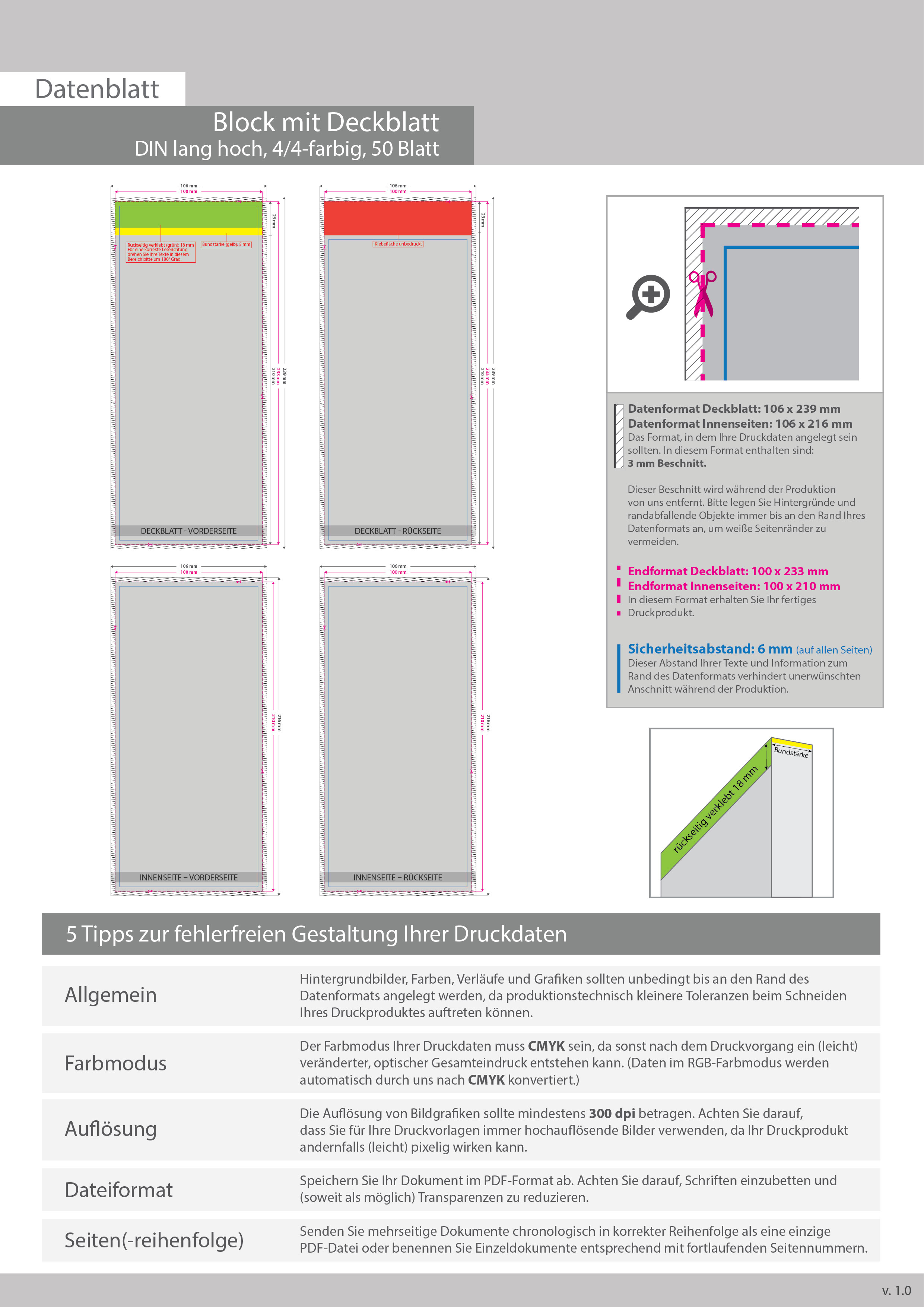 Block mit Leimbindung und Deckblatt, DIN lang, 50 Blatt, 4/4 farbig beidseitig bedruckt