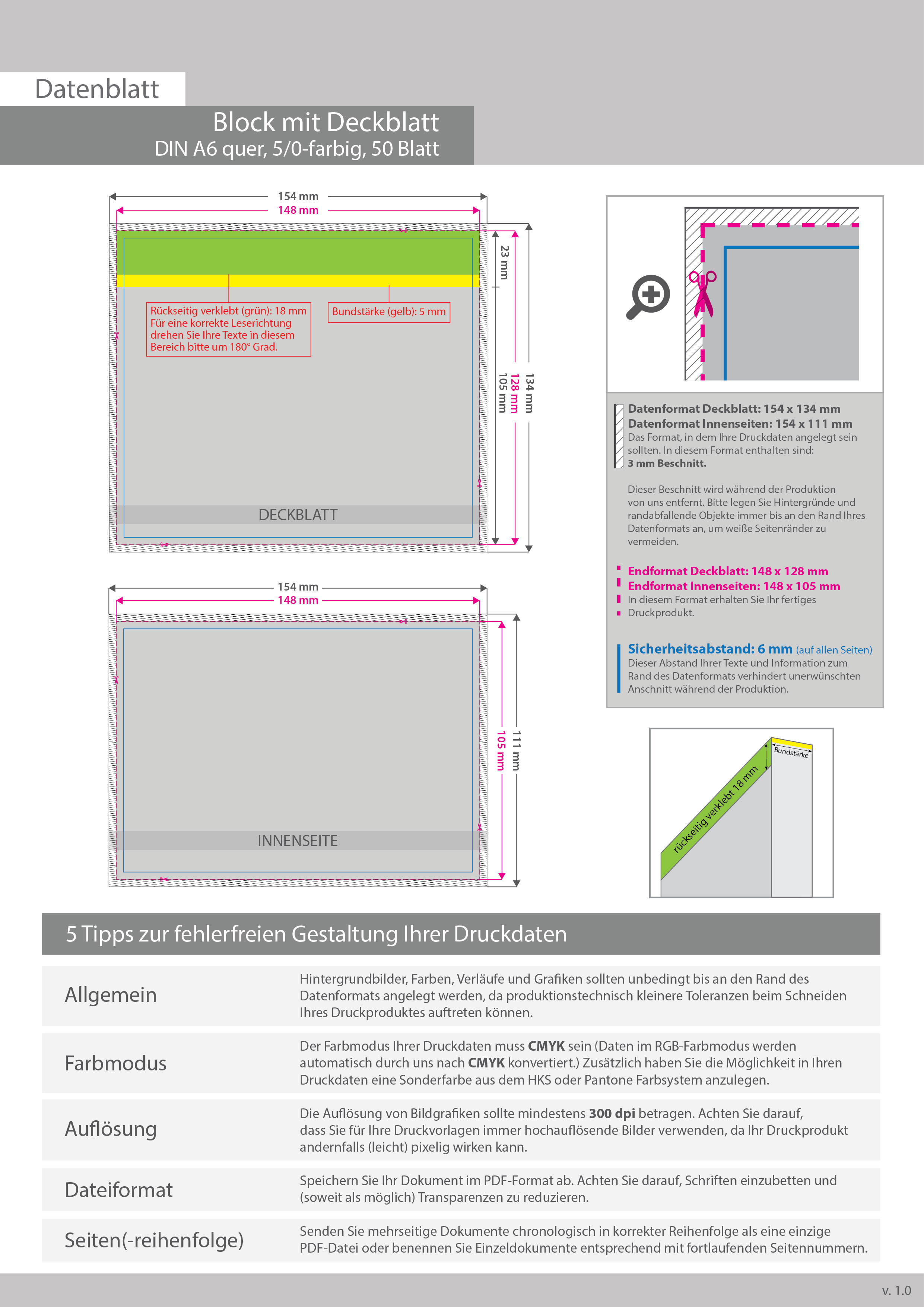 Block mit Leimbindung und Deckblatt, DIN A6 quer, 50 Blatt, 5/0 farbig einseitig bedruckt (CMYK 4-farbig + 1 Sonderfarbe HKS oder Pantone)